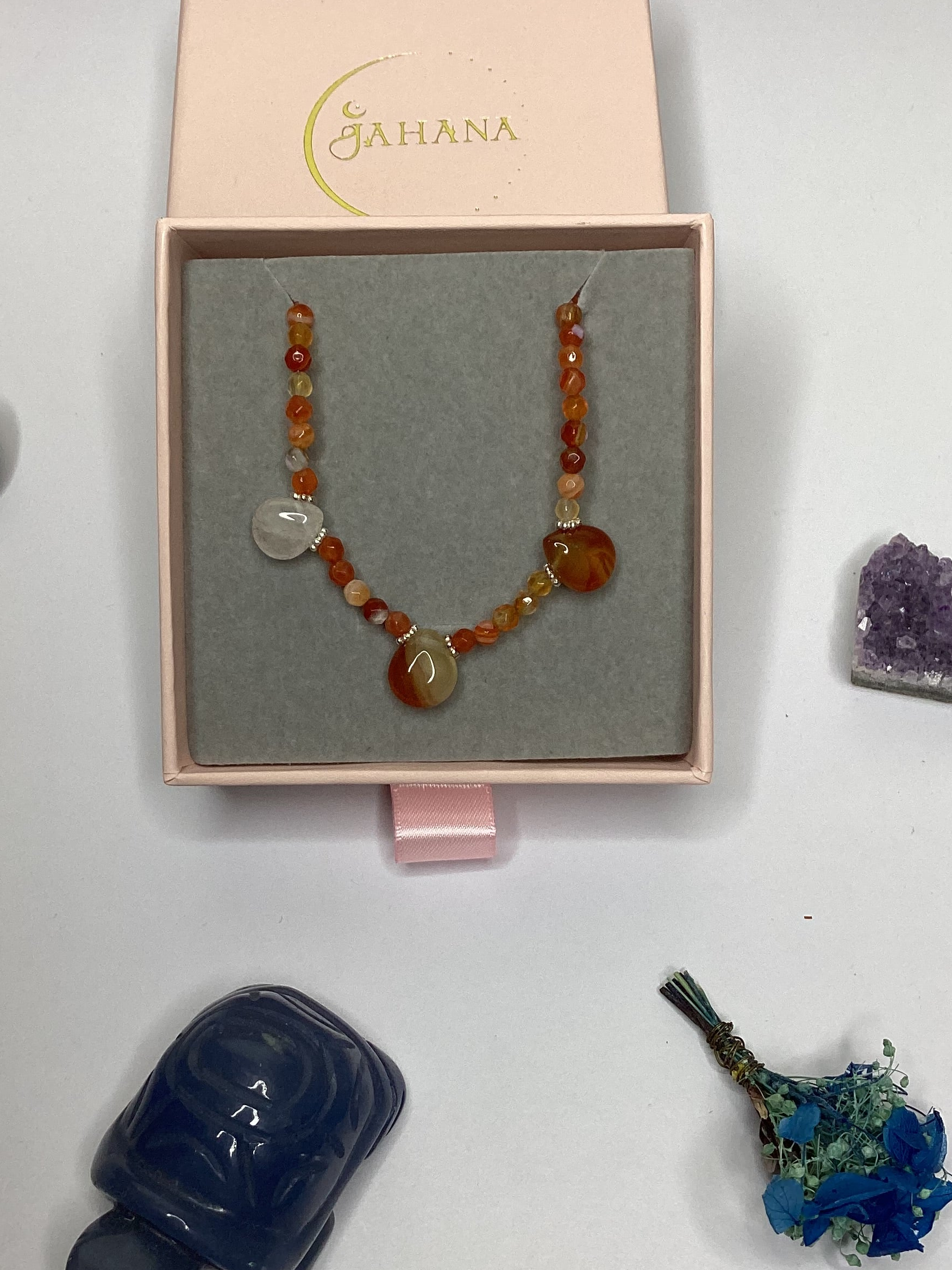 The Carnelian Tear Drop Necklace features a powerful stone known for its ability to activate the first three chakras.