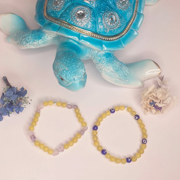 This protective bracelet blends the ancient symbolism of the Evil Eye with the bright, uplifting energy of lemon jade. The Evil Eye is traditionally worn as a symbol of protection — believed to deflect negativity and unwanted energy — while lemon jade is associated with positivity, confidence, and emotional balance.