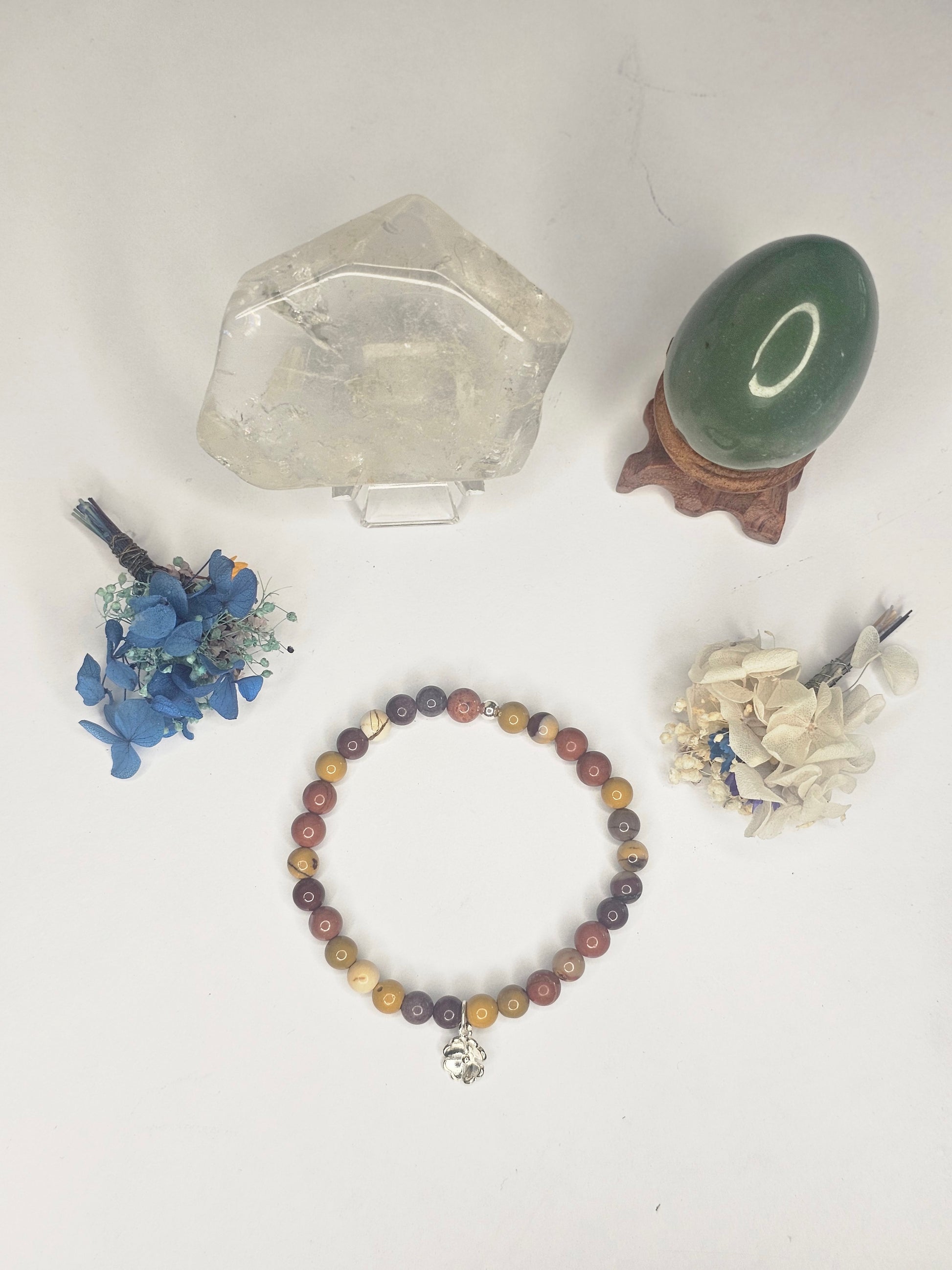 Experience the natural healing properties of Mookaite with our Flower Charm Bracelet.